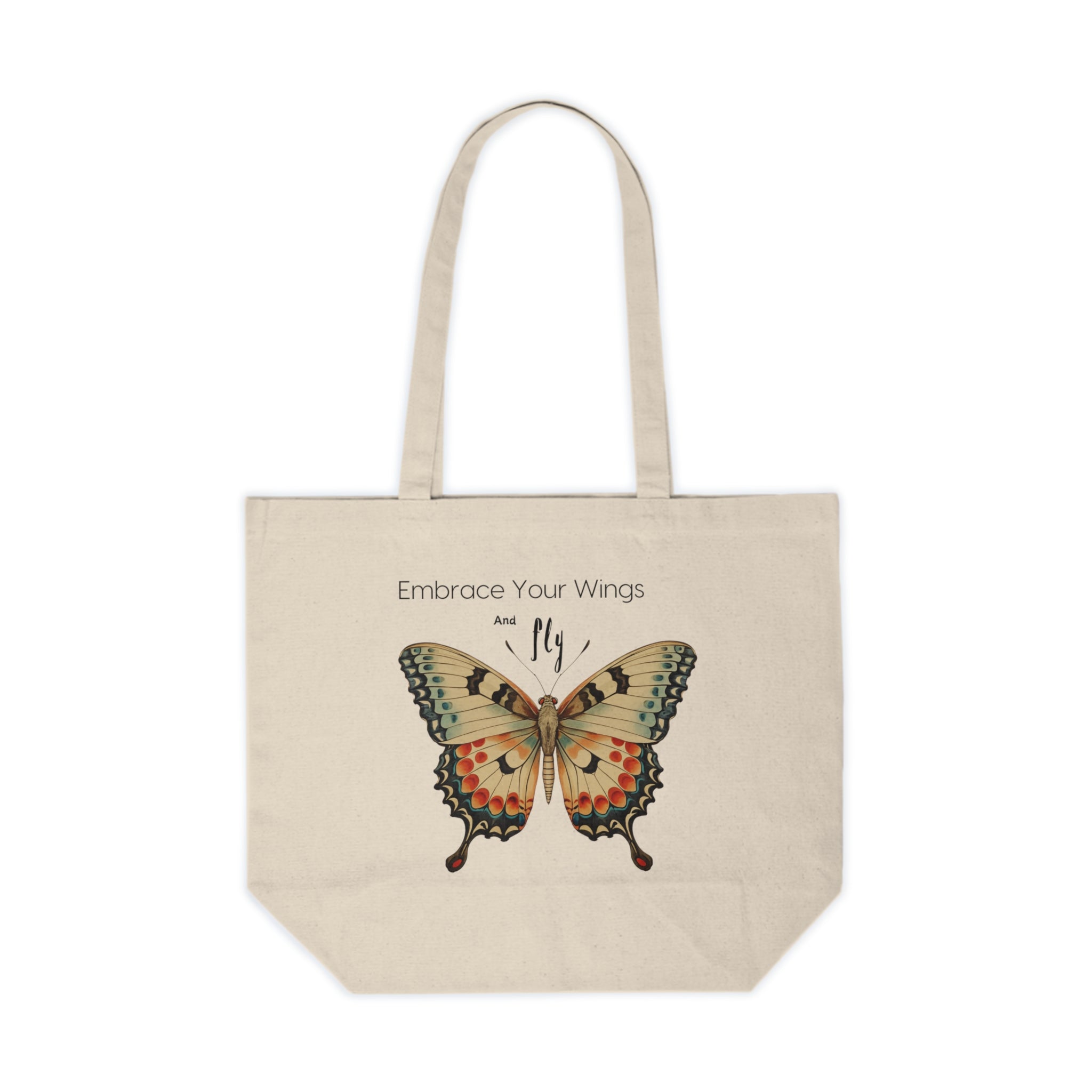 Embrace your wings and fly is an uplifting message to spread as you venture out for your weekly shopping trips, yoga classes, and beach days. Made from 100% 10oz cotton canvas, it is extremely durable and can withstand the wear and tear of everyday use. The 18"x15" design is simple yet elegant with two comfortable shoulder straps, making it easy to carry around. With its spacious and functional design, you can easily fit all your essentials without worrying about running out of space. So whether you're heading to the grocery store, the yoga studio, or the beach, this tote bag is the perfect accessory to carry along with you. *Handwash or gentle wash cycle with cool temperatures.